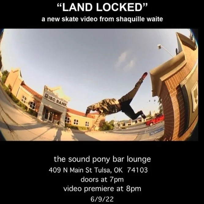 "LAND LOCKED" A SKATE VIDEO PREMIERE BY SHAQUILLE WAITE Thursday, June 9, 2022 7:00 PM 8:00 PM 19:00 20:00 Soundpony 409 N Main St Tulsa, OK, 74103 United States (map) Google Calendar ICS
